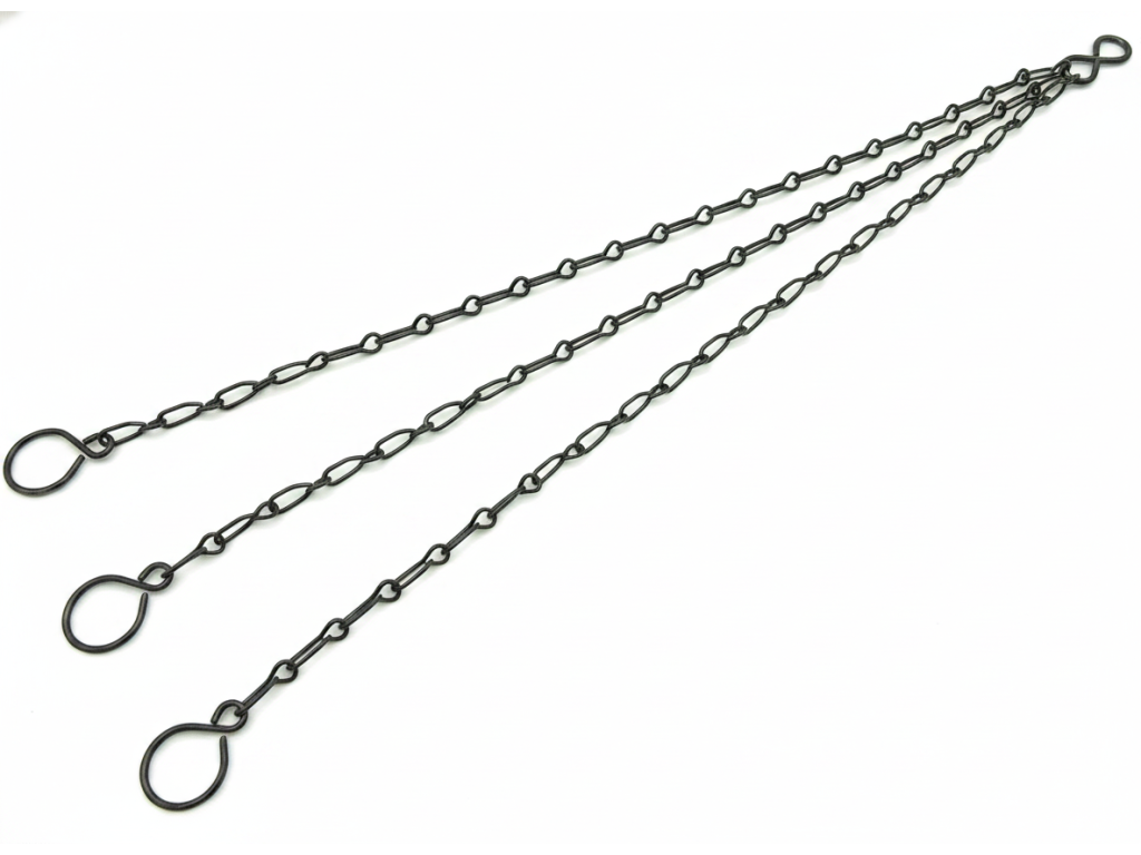Univerzální závěsné řetězy určené pro bezpečné a estetické zavěšení květináčů. Díky černé povrchové úpravě působí elegantně a snadno zapadnou do interiéru i exteriéru. Délka řetězů: 3× 35 cm. Typ zakončení: 3× SKT (háček / spona pro uchycení). Horní závěsný prvek: SH97. Stačí připevnit tři koncové háčky ke květináči nebo závěsnému koši a horní závěsný prvek SH97 zavěsit na hák, konzoli či jiný nosný bod.